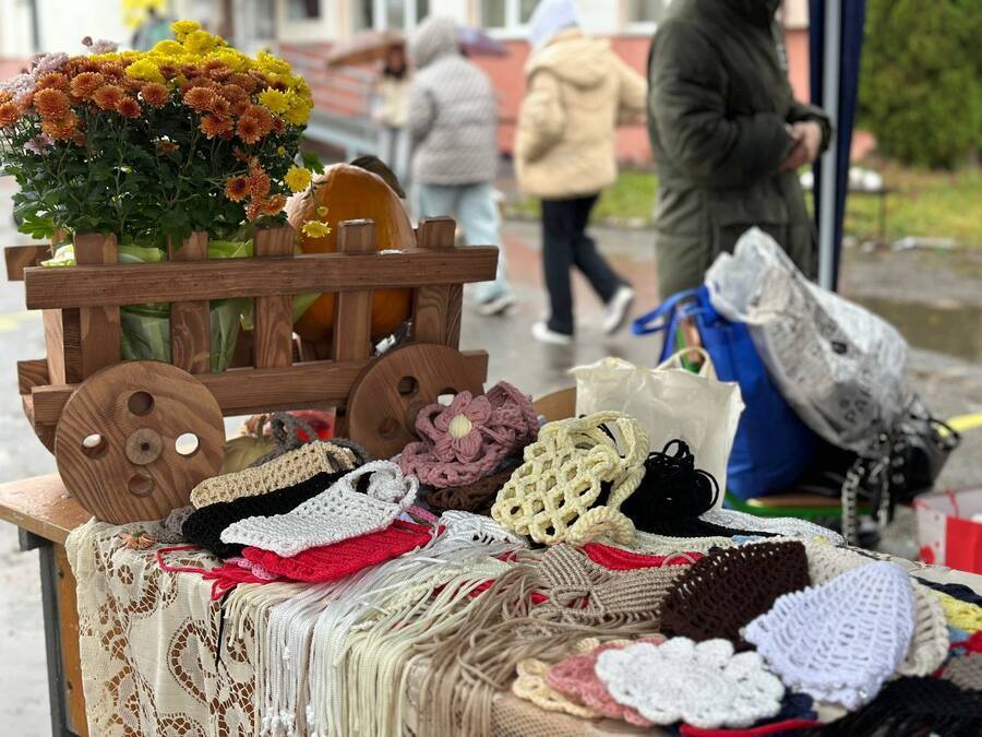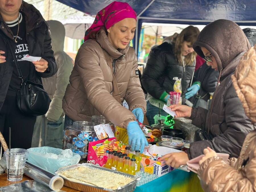 На подвір’ї ліцею №18 розгорнули ціле «наметове містечко». Навіть дощ не зупинив ярмарку – продавали під тентами, а аромат пиріжків, кави, тортиків та усмішки людей зігрівали краще за будь-яке сонце.