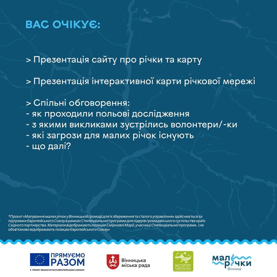 «Ми покажемо, як виглядає створена цифрова карта річок, розкажемо, що вдалося дослідити за ці місяці, і представимо вебсайт, який об’єднає всі зібрані дані, фото й історії про водойми міста», – зазначають організатори заходу.