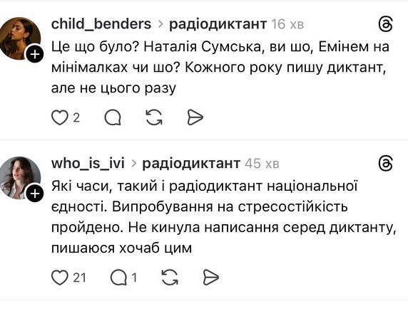 «Це що було? Наталія Сумська, ви шо, Емінем на мінімалках чи шо? Кожного року пишу диктант, але не цього разу», – написала одна з користувачок.
