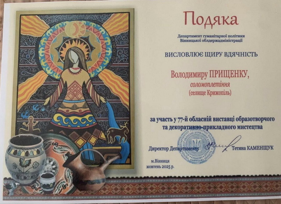 Досягнення Володимира Прищепка — це не лише демонстрація високого рівня майстерності у соломоплетінні, а й приклад відданості збереженню українських народних ремесел. Традиції, що беруть початок у невеликих містечках, як-от Крижопіль, завдяки таким майстрам набувають нового життя та національного визнання.