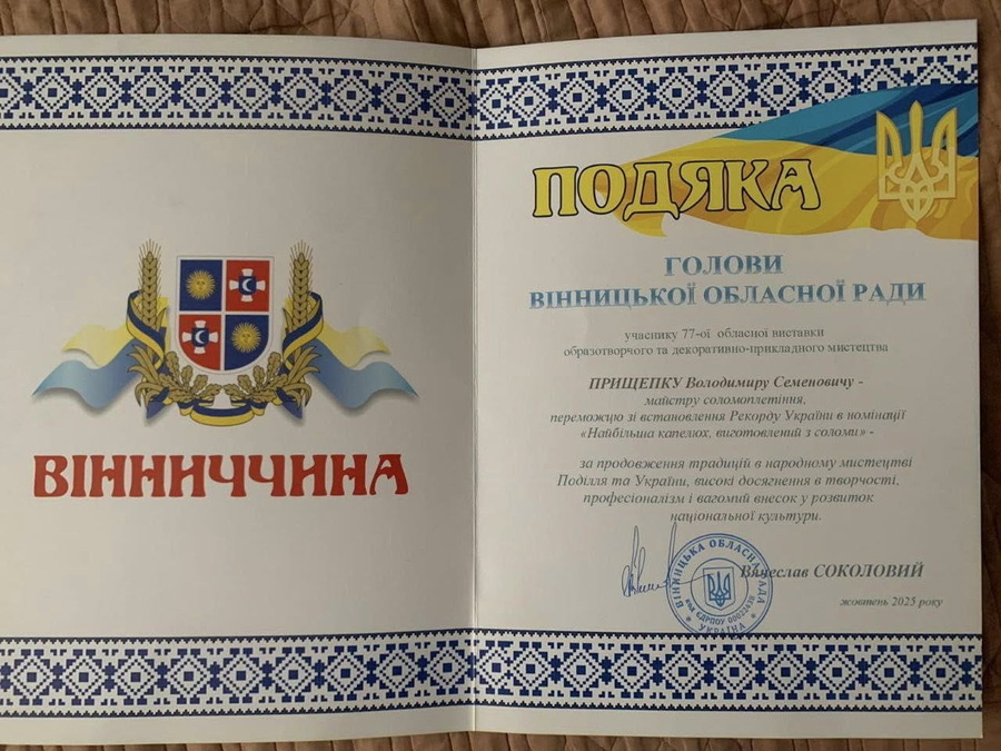 24 жовтня 2025 року у Вінниці офіційно зафіксували унікальне досягнення в категорії «Мистецтво». Майстер із Крижопільщини Володимир Семенович Прищепко створив найбільший в Україні капелюх із соломи, встановивши Рекорд України.