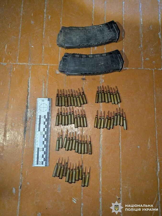 Під час реагування на подію поліцейські з’ясували, що чоловік може зберігати зброю без відповідних дозволів. У ході проведеного обшуку правоохоронці вилучили понад 300 набоїв різного калібру, гранати із запалами, вибухові речовини та автомат.