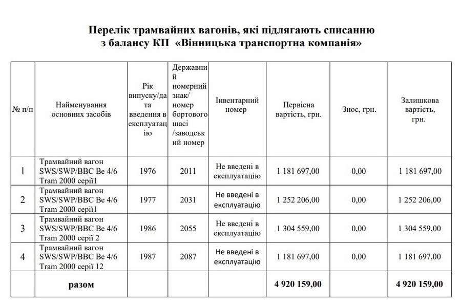 До списання включено 12 одиниць електротранспорту. Серед них тролейбуси ЗіУ-682 різних модифікацій, випущені переважно у 1989–1993 роках, а також два трамвайні вагони Ve 4/4 «Karpfen» 1960 року випуску, що були введені в експлуатацію у Вінниці у 2007 році. Вся техніка має 100% знос і нульову залишкову вартість, що робить її непридатною для подальшого використання.