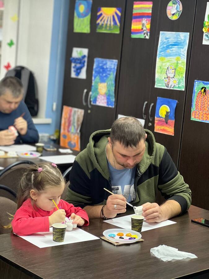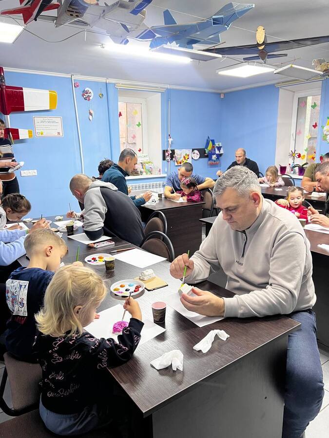 Під час майстер-класу учасники та учасниці розмальовували гіпсові фігурки. Діти віком від 5 до 10 років працювали разом із татами – поруч, у взаємодії, з підтримкою та увагою. Важливим акцентом стало те, що дорослі активно долучалися до процесу, допомагали та надихали маленьких митців. Саме так створюються теплі сімейні стосунки та формується відповідальне татівство.