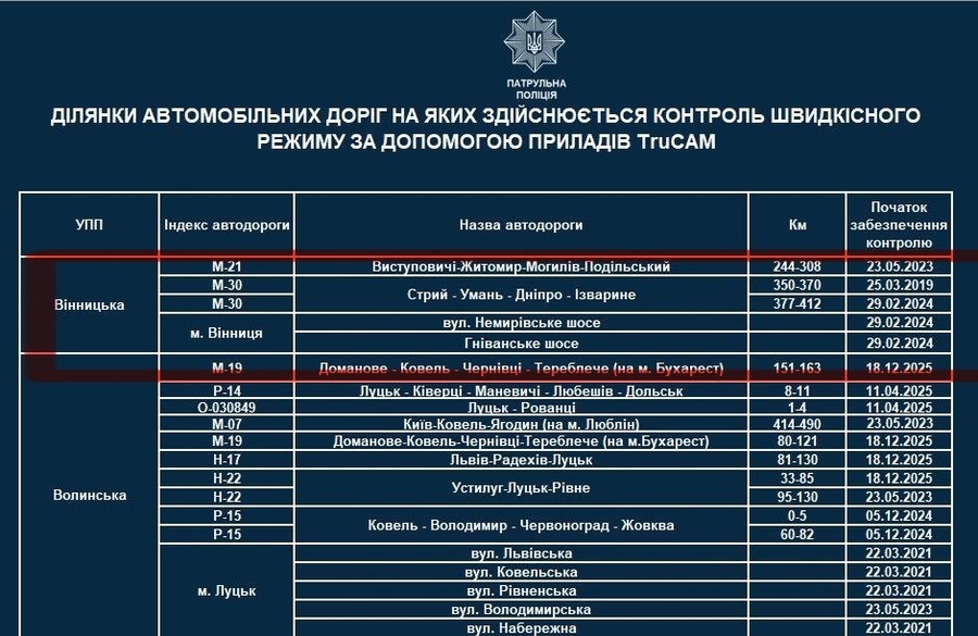 У 2025 році в Україні оновили перелік ділянок доріг і вулиць, на яких патрульна поліція здійснює контроль швидкісного режиму за допомогою приладів TruCAM. Загалом по країні додали нові відрізки та внесли зміни до частини чинних ділянок, однак у Вінницькій області перелік місць контролю залишився без змін.