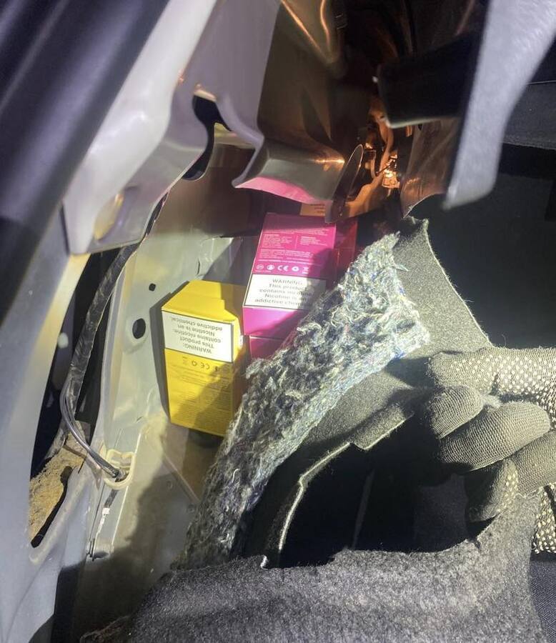 - в багажному відсіку з правої сторони, за обшивкою ‒ електронні пристрої для куріння, в кількості 20 штук, з написом «ELFBAR».