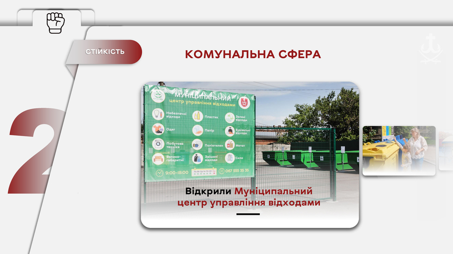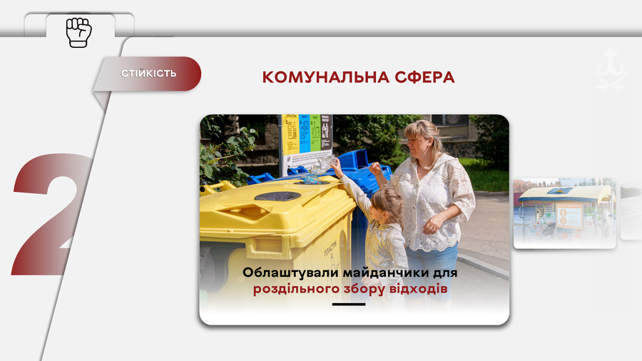В 2025 році стартували кілька муніципальних проєктів, націлених на свідоме поводження з відходами, які утворюються в побуті. Це сортування відходів в житловому секторі (торік облаштували близько 20 майданчиків для роздільного збору сміття) та створення Муніципального центру управління відходами. За 5 місяців роботи Центр відвідали понад 4 тисячі людей. Крім того, торік в приватному секторі громади встановили контейнери для ПЕТ-пляшок.