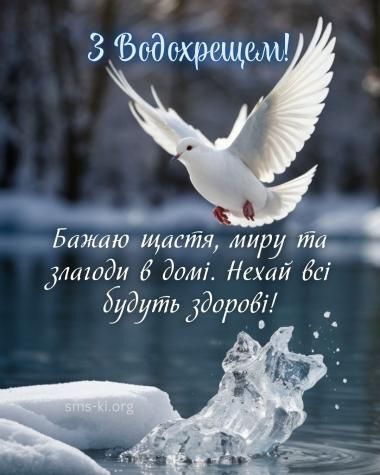 У світлий день Водохреща бажаємо вам миру, злагоди та внутрішньої гармонії. Нехай у вашій оселі панують тепло і взаєморозуміння, а віра допомагає долати всі життєві випробування. Хай цей день наповнить серце надією та світлом.