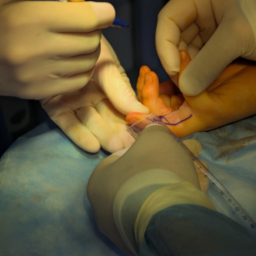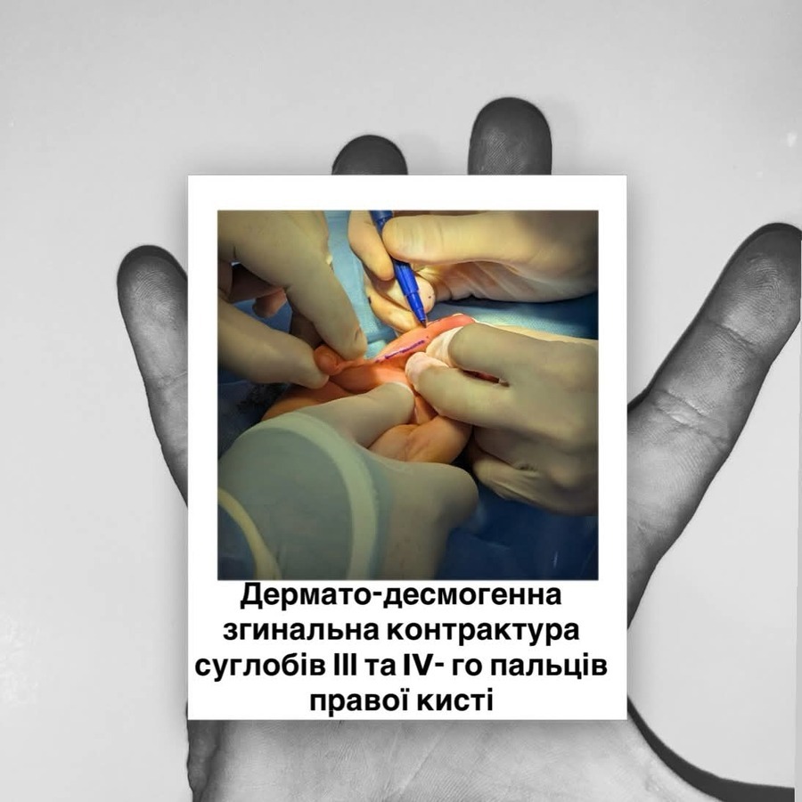 Хірургічне лікування було проведене з урахуванням віку дитини та особливостей рубцево змінених тканин. Під час операції лікарі виконали радикальне висічення патологічних рубців на долонній поверхні уражених пальців, ретельно оцінивши життєздатність навколишніх тканин. Для відновлення довжини шкіри та зменшення натягу було застосовано Z-подібну шкірну пластику, яка дозволяє знизити ризик повторного формування контрактури.