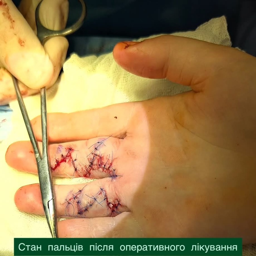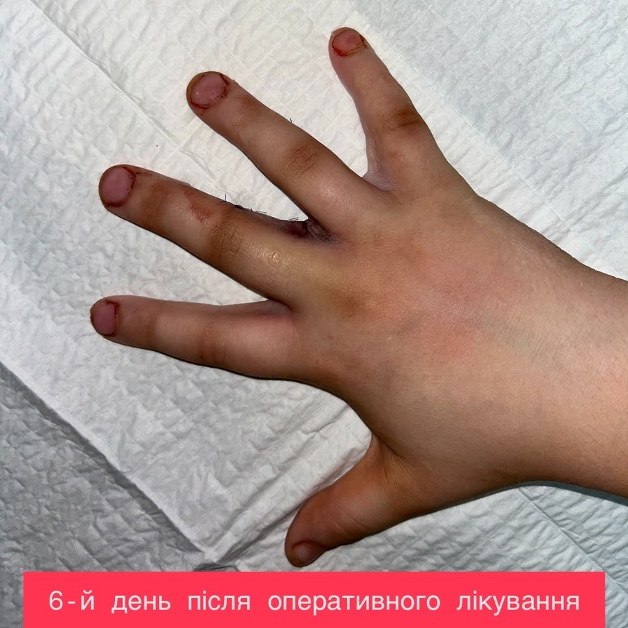 Після операції кисть дитини зафіксували спеціальною шиною у функціонально вигідному положенні з розігнутими пальцями. Така іммобілізація є важливою умовою правильного загоєння та формування рубця.