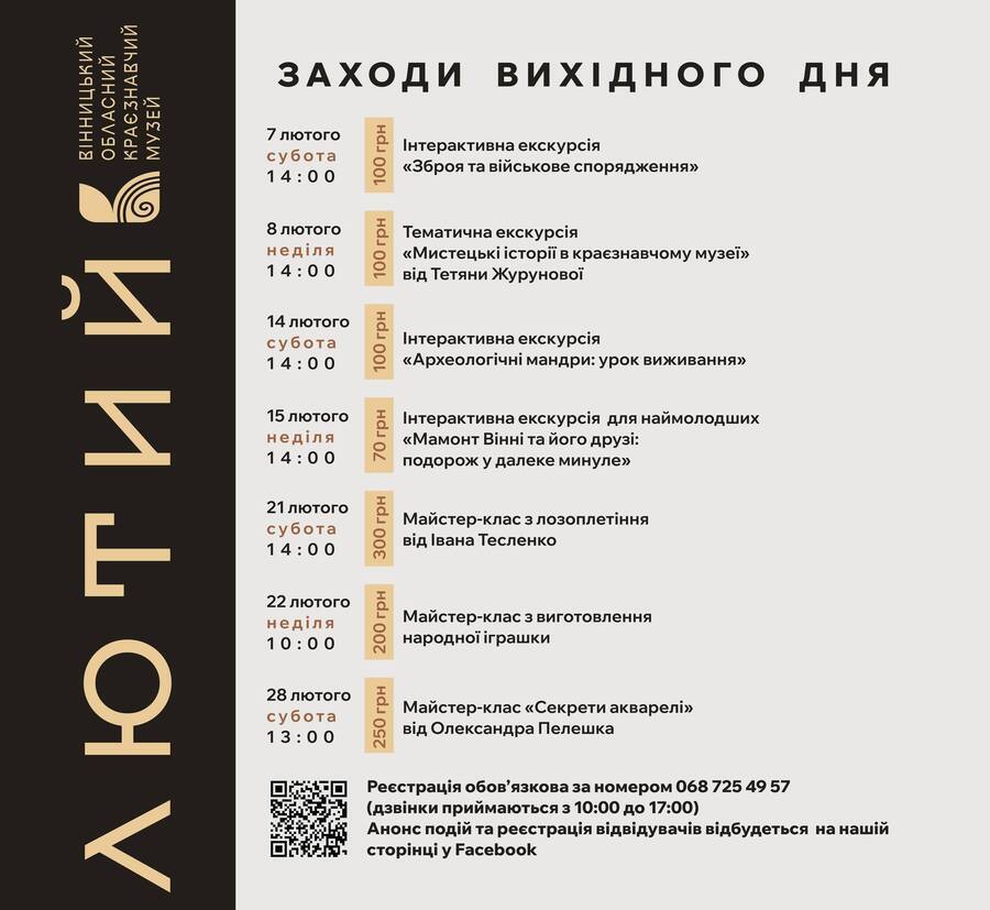 У Вінницькому обласному краєзнавчому музеї в лютому підготували насичену програму заходів вихідного дня. Музей запрошує вінничан і гостей міста провести вільний час у теплій атмосфері, поєднавши відпочинок, творчість і пізнання.