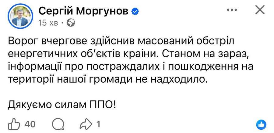 "У Вінниці руйнувань і постраждалих після нічної ворожої атаки немає", - про це у своїх слоціальних мережах вранці повідомив міський голова Вінниці Сергій Моргунов.