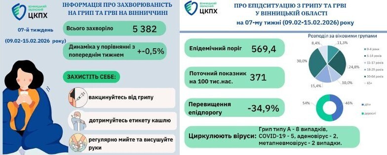 Упродовж другого тижня лютого на Вінниччині спостерігалося незначне зростання кількості випадків захворювання на гострі респіраторні вірусні інфекції. З 9 по 15 лютого в регіоні було зареєстровано 5 382 людини з симптомами грипу, COVID-19 та інших ГРВІ.