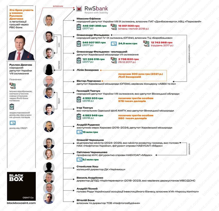 Ключову роль, за даними перевірок, відігравав RwS Банк, який забезпечував проведення операцій і подальше зняття значних сум готівки. За версією слідства, через цю модель було легалізовано понад 1 млрд грн.