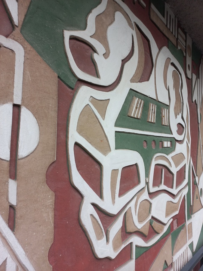 Центральне місце в одному з розписів посідає стилізоване обличчя. Людина тут виступає символом знань і творчої думки, що є першоосновою будь-якого розвитку. Наступне сграфіто логічно продовжує цю думку: у центрі зображені дві долоні, які тримають пристрій. Цей образ підкреслює важливість живої праці та втілення ідеї у матеріальну форму, нагадуючи, що техніка завжди перебуває під контролем людини.
