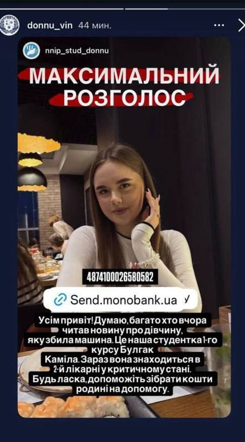 Вінницька студентська спільнота та рідні 18-річної Каміли Булгак просять про термінову допомогу. Дівчина постраждала у важкій ДТП, що сталася ввечері 15 березня на Гніванському шосе. Наразі першокурсниця перебуває у критичному стані під постійним наглядом медиків Другої міської лікарні, інформує My Vin.
