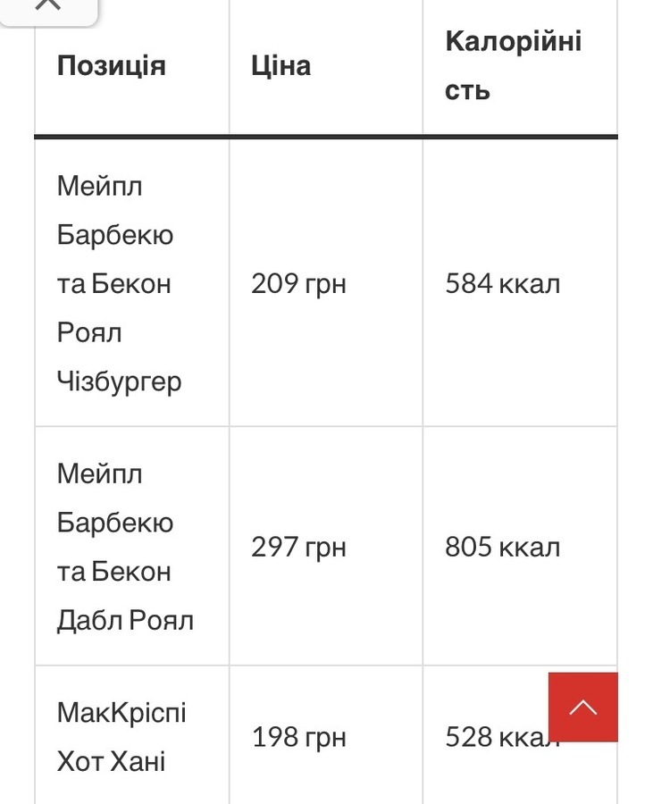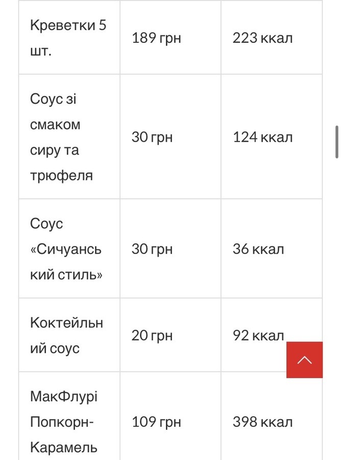 Ціни та калорійність новинок