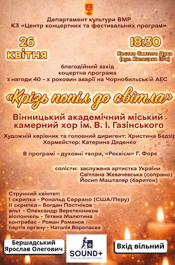 26 квітня, у сорокові роковини аварії на Чорнобильській АЕС, на вінничан та гостей громади очікує благодійний захід «Крізь попіл до світла» у виконанні Вінницького академічного міського камерного хору ім. В. І. Газінського. Меморіальна подія відбудеться о 18:30 у костелі Святого Духа (вул. Келецька, 117-А). Організатори: департамент культури Вінницької міської ради та КЗ «Центр культурних та фестивальних програм».