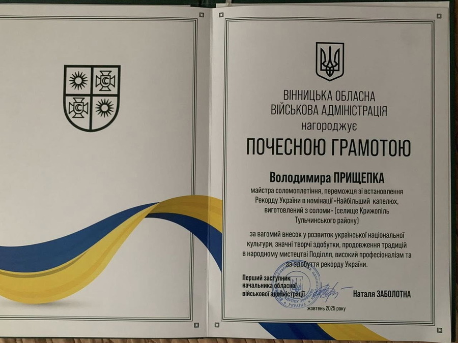 24 жовтня 2025 року у Вінниці офіційно зафіксували унікальне досягнення в категорії «Мистецтво». Майстер із Крижопільщини Володимир Семенович Прищепко створив найбільший в Україні капелюх із соломи, встановивши Рекорд України.