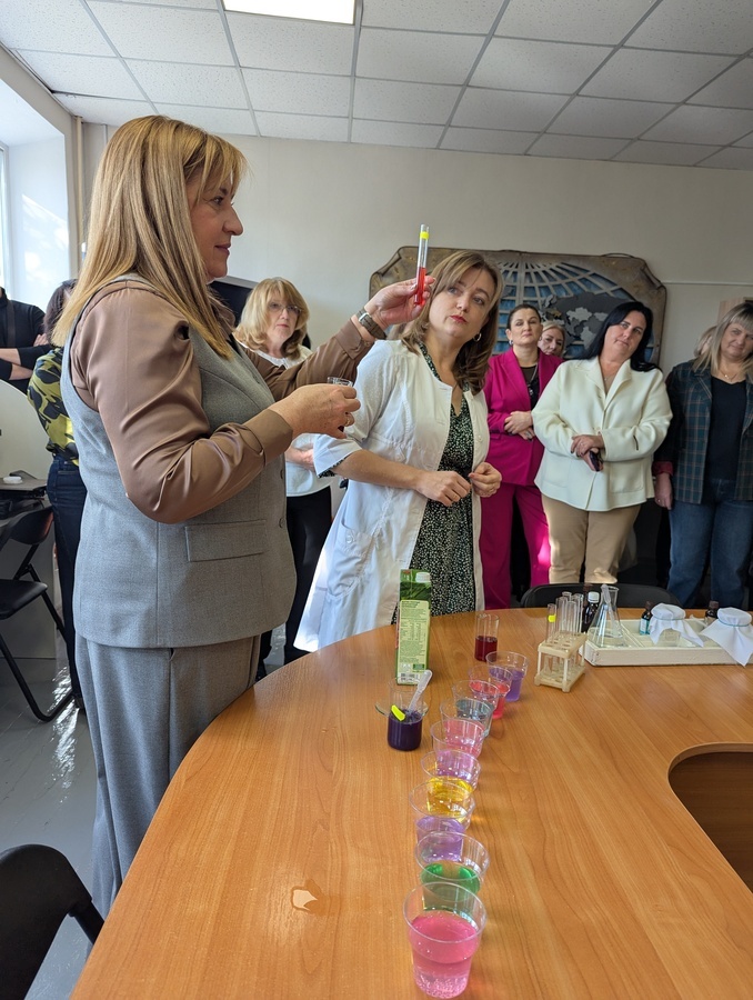 В її руках сік капусти перетворюється на природній індикатор для різних розчинів – кислотних, лужних, нейтральних. Прості на вигляд досліди викликали щире захоплення у дорослих учасників. Адже це не просто експеримент, а наочний доказ того, що хімія живе поруч із нами: у фруктах, овочах, у кожному побутовому процесі.