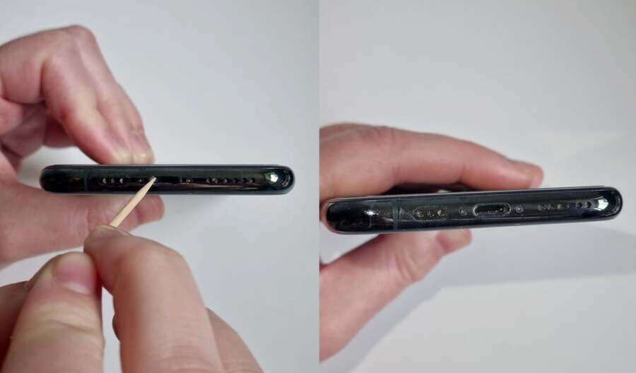 - Вставте ватяну паличку або зубочистку – акуратно проведіть по внутрішніх стінках порту, щоб прибрати залишки бруду або ворсу.