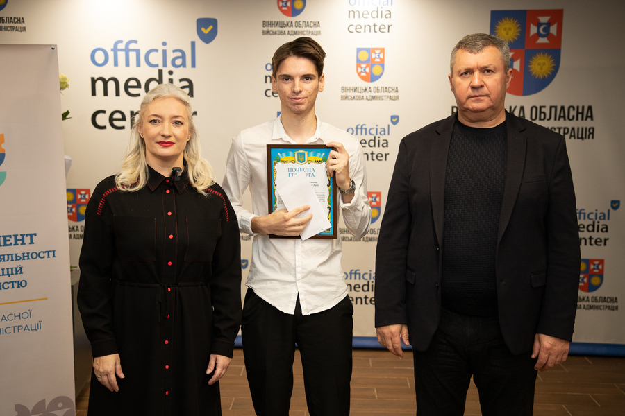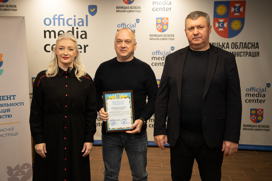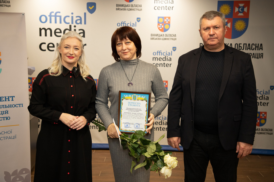 Сьогодні, 13 листопада, у Вінниці відзначили працівників радіо, телебачення та зв’язку напередодні їхнього професійного свята. Голова Вінницької обласної Ради Вячеслав Соколовий та перша заступниця начальника обласної військової адміністрації Наталя Заболотна привітали медійників та вручили їм Почесні грамоти обласної Ради та ОВА.