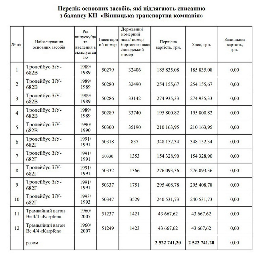 Виконавчий комітет Вінницької міської ради ухвалив рішення надати КП «Вінницька транспортна компанія» дозвіл на списання застарілих та повністю зношених основних засобів. Відповідний документ датований 20 листопада 2025 року.