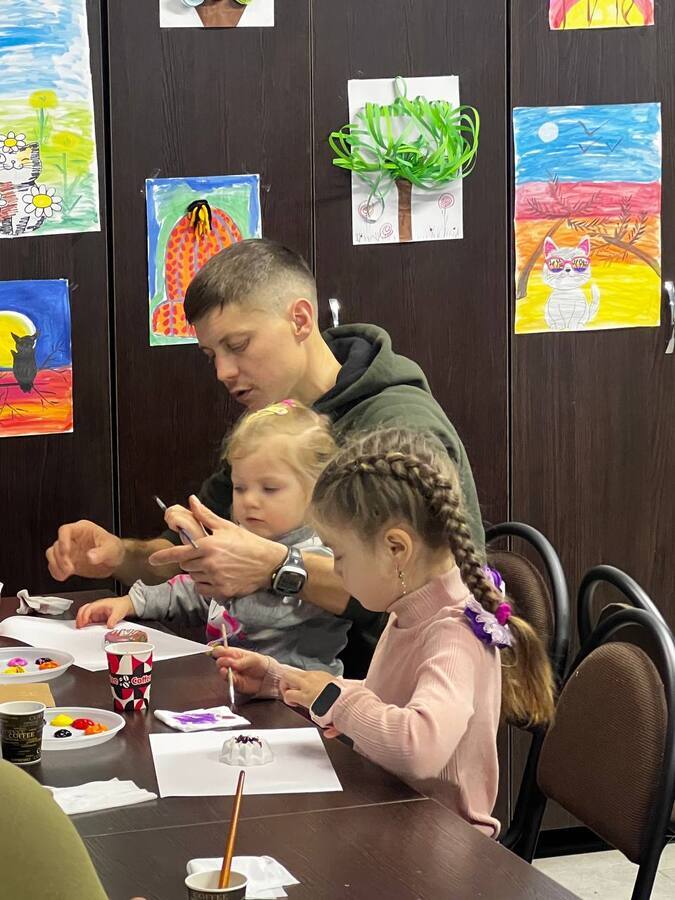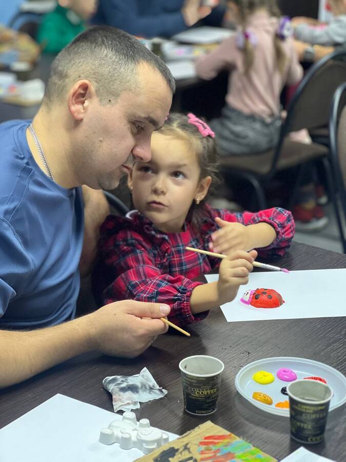 Під час майстер-класу учасники та учасниці розмальовували гіпсові фігурки. Діти віком від 5 до 10 років працювали разом із татами – поруч, у взаємодії, з підтримкою та увагою. Важливим акцентом стало те, що дорослі активно долучалися до процесу, допомагали та надихали маленьких митців. Саме так створюються теплі сімейні стосунки та формується відповідальне татівство.