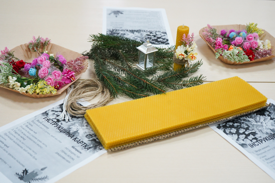 Для створення свічок кожна дитина отримала набір: лист вощини, нитку для ґноту, гілочки та шматок шпагату. Усе це учасники та учасниці поєднували на власний смак і перетворювали на теплий святковий виріб.