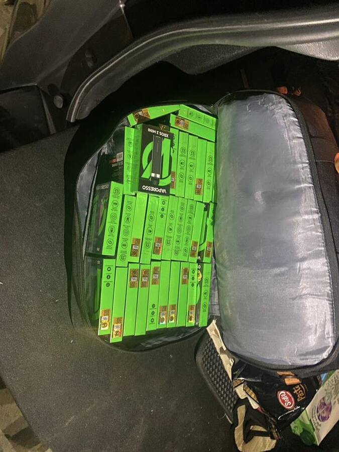 - в дорожній сумці з подвійним дном, яка знаходилась у багажному відсіку ‒ електронні пристрої для куріння, в кількості 34 штуки з написом «VAPORESSO»;