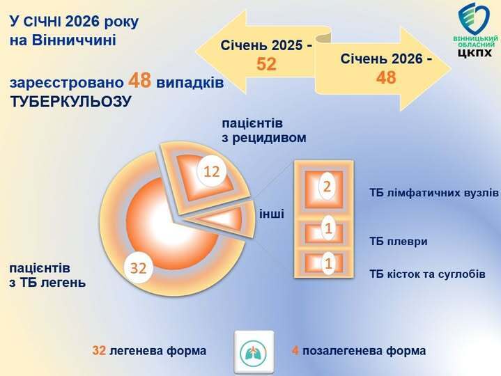 Фахівці Вінницького обласного центру контролю та профілактики хвороб оприлюднили статистику захворюваності на туберкульоз за січень 2026 року. За перший місяць року в регіоні зареєстровано 48 випадків цього інфекційного захворювання, повідомляє My Vin.