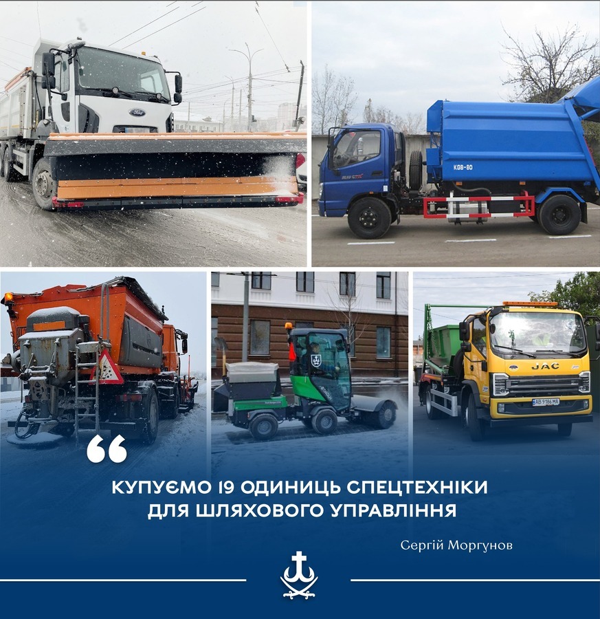 Йдеться про закупівлю 19 одиниць техніки, необхідної для щоденного утримання міста. Зокрема, планується придбати три пресувальні сміттєвози із заднім завантаженням, три багатофункціональні прибиральні машини, автомобіль для всесезонного утримання доріг, а також 12 багатофункціональних комунальних машин із навісним обладнанням.