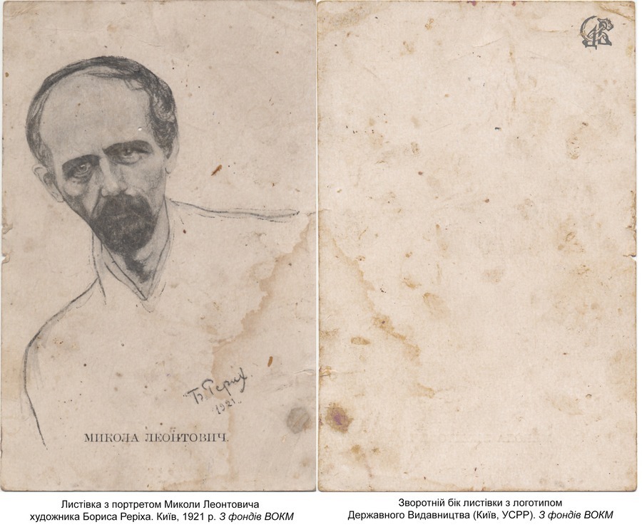 Чорно-біла листівка містить поясний образ композитора з підписом автора. На звороті зберігся логотип Державного видавництва тогочасного Києва. Борис Реріх, який був почесним членом комітету з вшанування пам’яті митця, імовірно, створював цей малюнок на основі останнього прижиттєвого фото Леонтовича. Хоча спочатку планувався великий наклад у 10 тисяч примірників, через брак коштів у 1922 році світ побачила лише обмежена кількість карток, що робить цей екземпляр особливим.