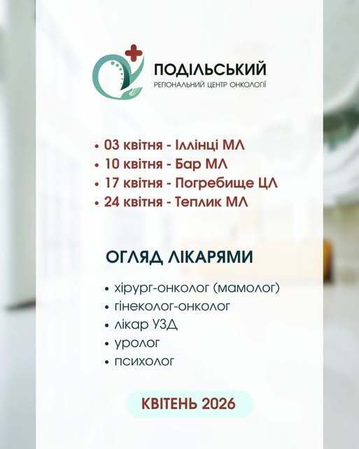 Упродовж квітня 2026 року консультативна бригада фахівців Подільського регіонального центру онкології здійснюватиме виїзди до територіальних громад Вінницької області. Метою таких візитів є забезпечення доступної медичної допомоги та рання діагностика захворювань безпосередньо у районах.