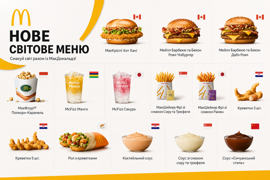 З 15 квітня McDonald’s офіційно запустив в Україні нову кампанію «Пограбування світового меню». Це перша європейська кампанія мережі, яка одночасно проходить у кількох країнах. В українських ресторанах з’явилися 13 новинок із 8 країн, а частина позицій, як-от креветки, доступна у двох форматах. Спробувати їх можна до 24 червня 2026 року або до завершення запасів. Замовлення доступне в залі через термінали, на МакДрайві, через МакДелівері та в мобільному застосунку, повідомляє My Vin.