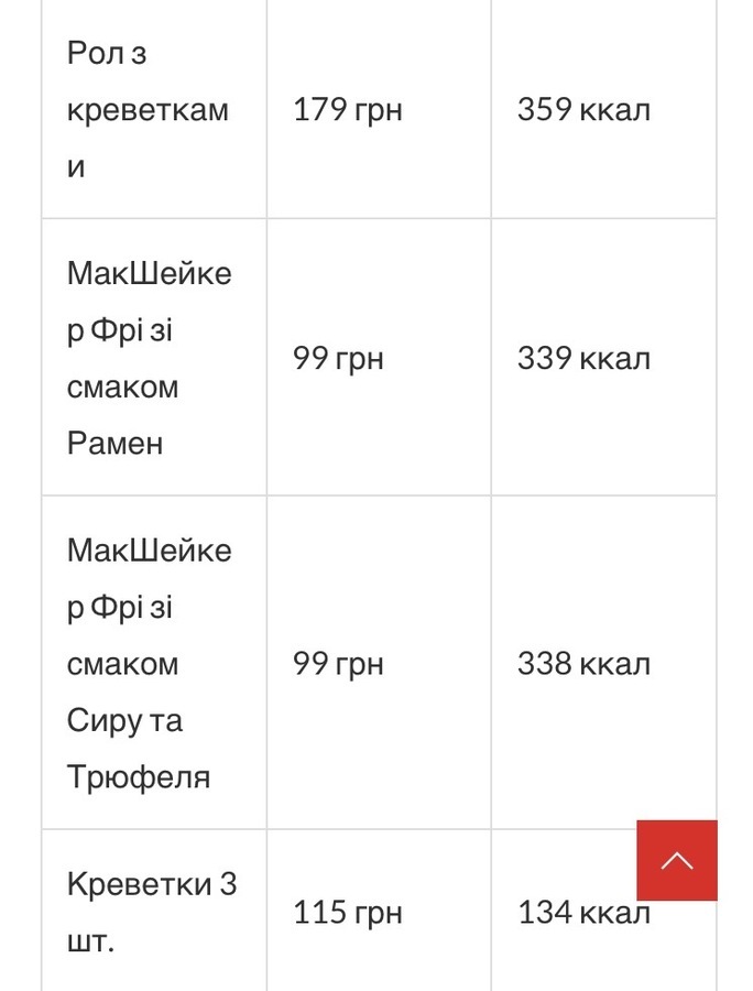Ціни та калорійність новинок