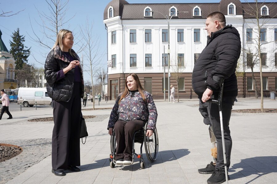 «Тут стало доволі комфортно пересуватися. Адже в крісла колісного є маленькі передні колеса, і часто, встрягаючи ними в яку-небудь перешкоду, ризикуєш випасти з нього. Подібні ситуації були навіть у мене, при тому, що я вже досвідчений користувач. Якщо говорити про людей, які щойно отримали травму і пересуваються на допоміжних засобах чи кріслах колісних, для них такі моменти можуть бути набагато небезпечнішими. Зараз, на площі рівна плитка без “фаски”, і коли ти їдеш, немає додаткової вібрації. Також мені подобаються нові вимощення навколо дерев. Тут використали іншу поверхню — плитку під "старе місто", щоб позначити цю територію для людей, які мають порушення зору. Тобто не завжди й не всюди потрібно вистеляти кілометри тактильної плитки — можна розв'язати багато питань подібними дизайнерськими рішеннями», — зазначає вона.