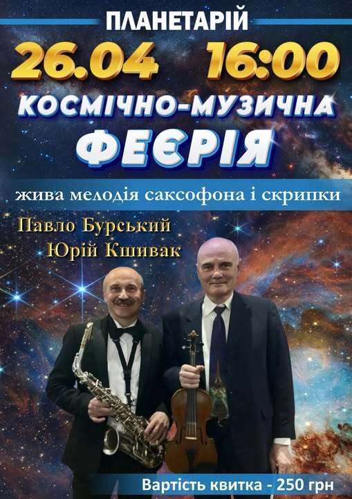 Для гостей виступатимуть улюблені музиканти — Павло Бурський та Юрій Кшивак. У їхньому виконанні прозвучать партії оксамитового саксофона та чуттєвої скрипки. Це буде більше, ніж звичайний концерт, адже організатори обіцяють справжнє аудіовізуальне занурення у космос. Музика стане своєрідним космічним кораблем, який допоможе слухачам перенестися далеко за межі буденності та отримати незабутні емоції.